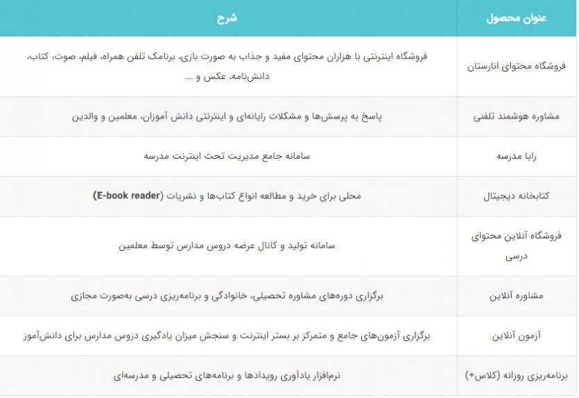 - عرضه محتواها، خدمات درسی و علمی درقالب 20 هزار ساعت فیلم آموزشی، 40 هزار نمونه آزمون به صورت آنلاین، محتواهای آموزشی دانشآموزی صدا و سیما، 2 هزار انیمیشن آموزشی (ویژه دبیرستان)، 2 هزار برنامه اندرویدی علمی و فکری و 8 هزار کتاب الکترونیکی برای دانشآموزان و برنامه های آموزش تولید محتوای الکترونیکی برای حدود 4000 معلم در سراسر کشور.