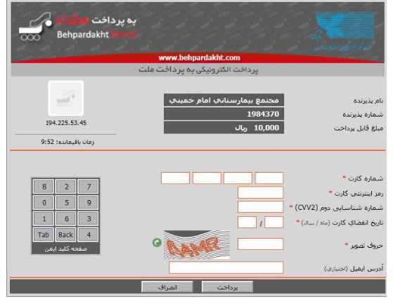 - لازم به ذکر است جهت ورود کد کنترلی صفحه پرداخت نوبت اینترنتی بیمارستان امام خمینی حتما از کیبرد لمسی باز شده برروی صفحه استفاه کنید.