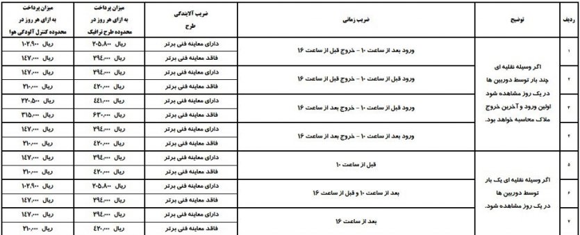 - با اینکه قیمت پایه مجوز طرح ترافیک 35 هزار تومان است، فردی که دارای معاینه فنی برتر باشد و ساعت غیر اوج در محدوده طرح ترافیک تردد کند، 20 هزار و 580 تومان پرداخت میکند و فردی که دارای معاینه فنی عادی است و در ساعت شلوغ وارد طرح شود باید 63 هزار تومان بپردازد.