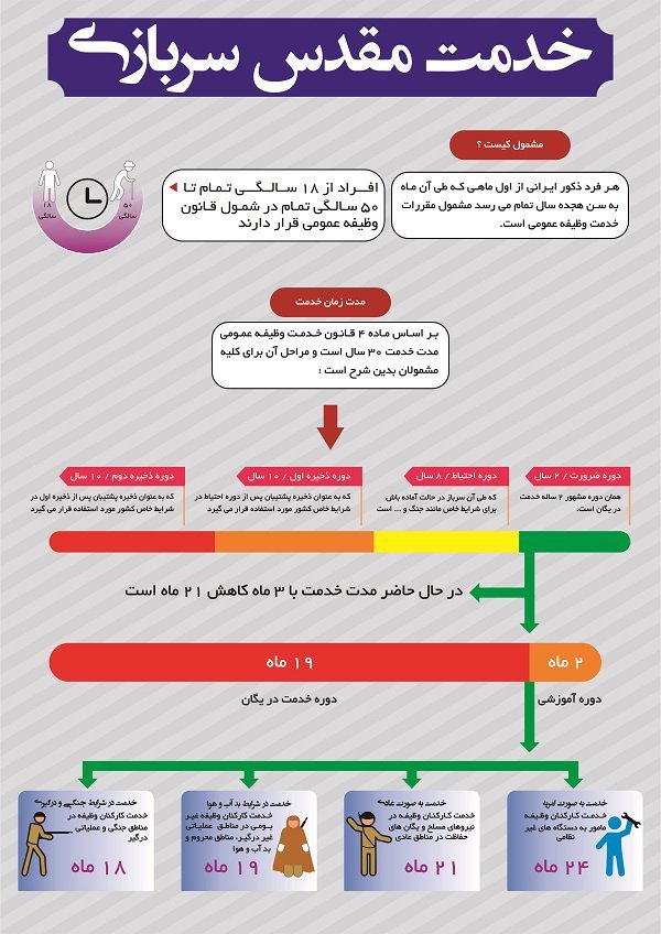 - هرفرد ذكور ايرانی از اول ماهی كه طی آن ماه به سن هجده سال تمام میرسد مشمول مقررات خدمت وظيفه عمومی است.