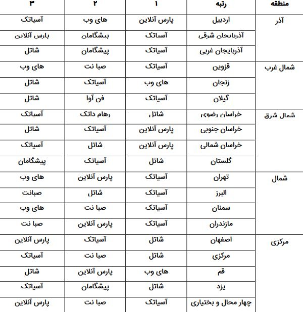 این ارزیابی به صورت استانی انجام شده و هدف از آن، بهبود کیفیت و ایجاد فضای سالم رقابتی بین اپراتورهای ارائهدهنده خدمات اینترنت در تمامی استانهای کشور عنوان شده است تا دارندگان پروانه این خدمات ضمن حفظ نقاط قوت خود، در مسیر ارتقاء کیفیت سرویس، با شتاب بیشتری حرکت کنند. وضعیت رتبهبندی ۳ اپراتور برتر از نگاه مشتریان در مناطق سازمان تنظیم مقررات و ارتباطات رادیوئی به تفکیک هر استان در جدول زیر درج شده است:
