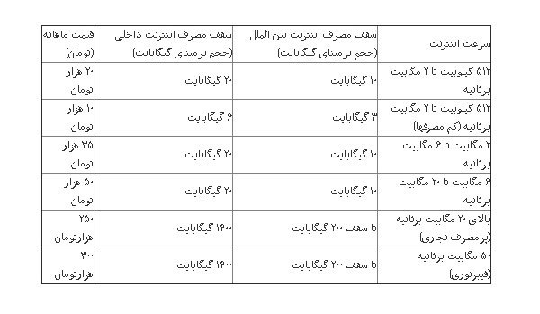 قیمتهای جدید اینترنت که توسط دیگر رسانهها از قول صادق عباسی شاهکوه معاون بررسیهای فنی و صدور پروانه رگولاتوری اعلام شده بهشرح زیر است: