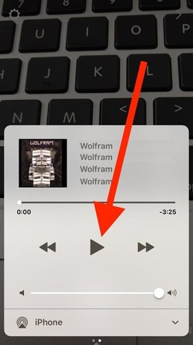 4- انگشت خود را روی صفحه مربوط بهدوربین بگذارید و بهسمت بالا بکشید تا بخش "کنترل سنتر" (Control Center) در iOS باز شود. دوباره انگشتتان را بهسمت بالا بکشید تا بهصفحه "موزیک" دسترسی پیدا کنید و سپس دکمه Play را لمس کنید تا فایل موسیقی موردنظرتان پخش شود.
