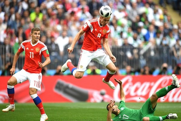 روسیه با بهثمر رساندن گل سوم در دقیقه 71 تسط کامل خود بر زمین را بهرخ عربستان میکشد (عکس از کای فافنباخ)