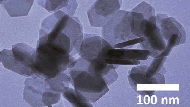 یک تصویر میکروسکوپ الکترونی از لایه حساس به دی اکسید نیتروژن ساخته شده از تکههای نازک اتم دی سولفید قلع که 500,000 بار بزرگتر شده است.