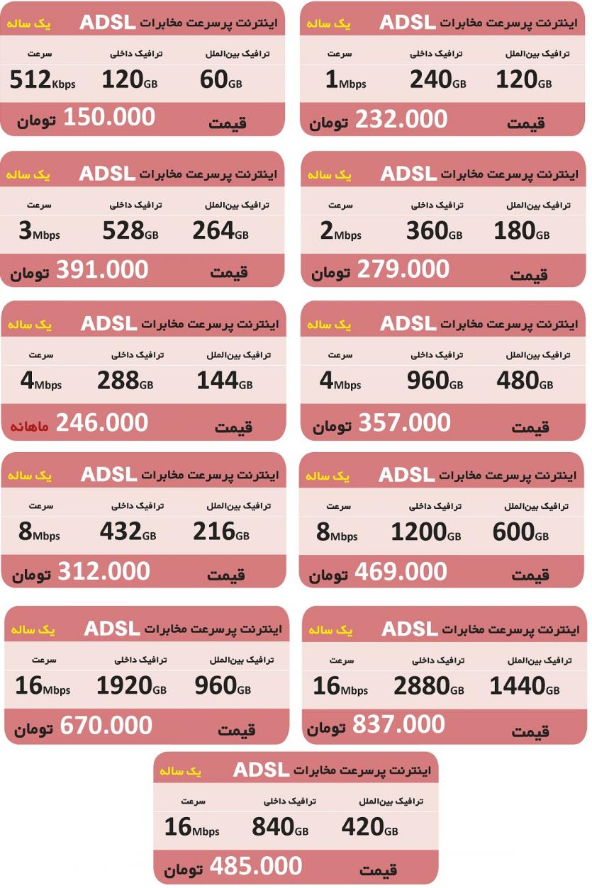 - طبق جدول منتشر شده اینترنت ADSL مخابرات از سوی شرکت مخابرات ایران، تعرفههای جدید اینترنت ADSL مخابرات با حداقل سرعت 1Mbps بر ثانیه و حجم 10 گیگابایت ماهانه یا حداکثر سرعت 16 مگابیت بر ثانیه و حجم 120 گیگابایت ماهانه به مشترکان ارائه میشود.
