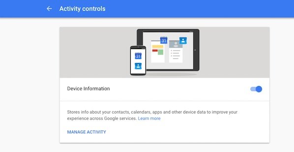 روی گوشیهای اندرویدی، گوگل اطلاعات مرتبط با دادههای شخصی همچون مخاطبان، قرارملاقاتهای ثبت شده در تقویم و حتا میزان دادههایی که هر برنامه مصرف کرده است را ثبت میکند. در نتیجه گوگل میداند که هر برنامه کاربردی را چند مرتبه اجرا کرده، چه مدت از برنامه استفاده کرده و در چه زمانهایی برنامهها را اجرا کردهاید. با این رویکرد گوگل الگوی رفتاری شما را شناسایی کرده و برای بهبود سیستمعامل خود از این اطلاعات استفاده میکند. اما برای غیرفعال کردن این قابلیت به صفحه Activity Controls رفته و سپس به بخش تنظیمات Device Information بروید. برای حذف یک موجودیت خاص، نیز باید به داشبورد اصلی My Activity بروید.