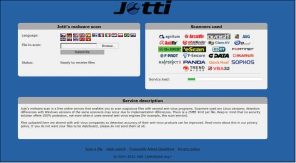 مسدود کردن فعالیتها روش دیگری است که برنامههای ضد ویروس از آن استفاده میکنند. در تکنیک مسدودکردن فعالیت، زمانی که یک ویروس شروع به اجرا میکند ضدویروس فعالیت آن را مسدود کرده و مانع از آلوده شدن برنامهها یا دادههای دیگر میشود. این تکنیک زمانی که سیستمی راهاندازی شده و مادامی که خاموش شود به فعالیت خود ادامه میدهد. یکی از روشهایی که برای آزمایش ویروسها، کرمها و بدافزارها از آن استفاده میشود بهکارگیری یک جستجوگر آنلاین ویروسها است. یکی از این سرویسهای محبوب Jotti است. سرویس فوق فایلهای مشکوک را برای پیدا کردن ویروسها یا بدافزارها آزمایش میکند. شکل زیر نمونه رابط کاربری سرویس فوق را نشان میدهد: