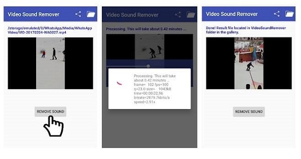 اگر به دنبال یک اپ اندرویدی آسان برای حذف صدا از فیلم هستید، Video Sound Remover بهترین گزینه برای انتخاب است. این اپ میتواند تنها با یک ضربه صدا را از فیلم حذف کند. فقط کافیست فایل صوتی را مرور کرده و سپس برای حذف صدا روی “Remove Sound” ضربه بزنید.