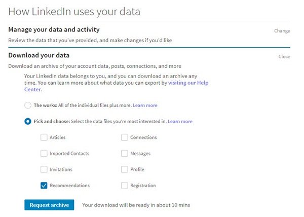 4- چکباکسهای ویژه مربوط به اطلاعاتی که موردنظرتان است را انتخاب کنید. بهعنوان مثال، میتوانید تمام آرشیو لینکدین یا فقط مقالات و یا پیامهایی که میخواهید را دانلود کنید.