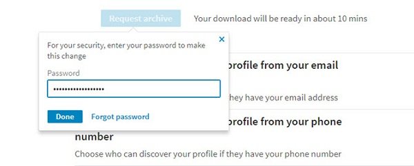 5- لینکدین مدت زمان آماده شدن آرشیو برای دانلود را بهشما اطلاع میدهد. سپس، از شما خواسته میشود تا گذرواژهتان را دوباره وارد کنید.