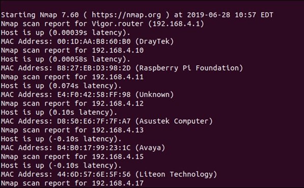 Nmap یک ابزار نگاشت شبکه است. nmap با ارسال پیامهای مختلف شبکه مختلف به آدرسهای آیپی در محدودهای که ما برای آن مشخص میکنیم کار میکند. بیایید یک اسکن ساده با nmap را انجام دهیم. ما قصد داریم از گزینه -sn (پویش بدون پورت) استفاده کنیم. این گزینه به nmap میگوید در حال حاضر نیازی نیست وضعیت پورتهای روی دستگاهها را بررسی کند. در نتیجه یک اسکن سبک و سریع را انجام خواهد داد. دقت کنید هرچه تعداد دستگاههای درون یک شبکه زیاد باشند، به همان نسبت انجام کار نیز زمانبر خواهد بود. آدرس آیپی که ما قصد استفاده از آنرا داریم آدرسی است که از اجرای فرمان قبل به دست آوردیم. در اینجا پارامتر 192.168.4.0/24 برای nmap بع معادل آدرس آیپی برای شروع برابر با 192.168.4.0 است ترجمه شده و همه آدرسهای آیپی تا محدوده 192.168.4.255 را شامل میشود. دقت کنید ما از sudo به شرح زیر استفاده میکنیم.