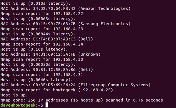 ما اکنون فهرستی از دستگاههای متصل به شبکه در اختیار داریم، بنابراین میدانیم چه تعداد دستگاه به شبکه متصل شدهاند. در تصویر بالا 15 دستگاه روشن و متصل به شبکه وجود دارد. ما نام برخی تولیدکنندگان دستگاهها را نیز میدانیم. به احتمال زیاد مشخصات برخی از دستگاهها همچون رزبری پای به روشنی قابل تشخیص است، اما برای برخی از دستگاهها باید کار بیشتری انجام دهید.