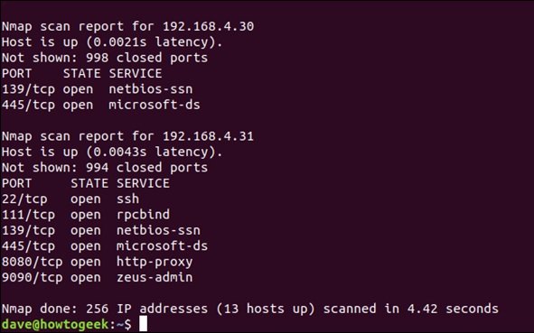 اگر گزینه -sn را از فرمان nmap حذف کنیم، nmap پورتهای دستگاهها را نیز بررسی میکند. هر برنامه یا سرویس درون یک دستگاه یک شماره پورت دارد. ترافیک شبکه به یک آدرس آیپی و یک پورت و نه فقط به یک آدرس آیپی تحویل داده میشود. برخی از شماره پورتها از پیش تعیین شده یا رزرو شدهاند. آنها همیشه برای انتقال ترافیک شبکه برای انجام کار خاصی استفاده میشوند. بهطور مثال، پورت 22 برای اتصالات SSH محفوظ است و پورت 80 برای ترافیک وب HTTP محفوظ است. ما قصد داریم از nmap برای اسکن کردن پورت هر دستگاه استفاده کنیم تا ببینیم کدامیک از آنها باز هستند. برای این منظور فرمان زیر را اجرا میکنیم.