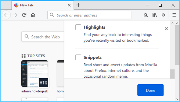 تیک تمام چیزهایی را که نمیخواهید ببینید بردارید و سپس کلید "Done" را بزنید. این لیست شامل نوار جستجو، سایتهای برتری که اغلب از آنها بازدید میکنید، مقالات پیشنهاد شده توسط Pocket، هایلایتهای مربوط به بوکمارکها و تاریخچه و Snippetها بههمراه اطلاعات موزیلا که اکثرا در پایین صفحه تب جدید نمایش داده میشود هستند.