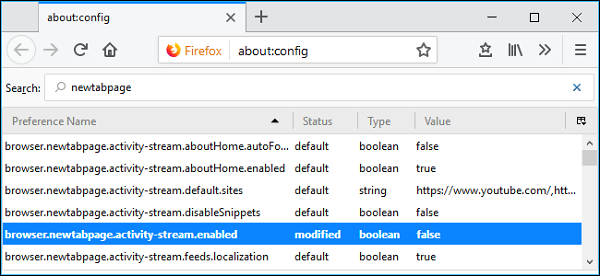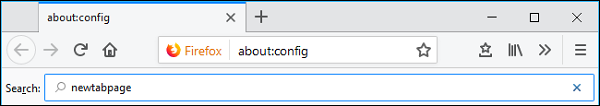 در جعبه جستجوی بالای صفحه "about:config" عبارت "newtabpage" را تایپ کنید تا تنظیمات مربوطه را پیدا کنید.