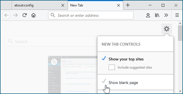 مجددا تب جدید فایرفاکس را بههمان سبک قبلی مشاهده میکنید. اگر تصمیم دارید یک صفحه خالی نشان داده شود روی چرخدنده کلیک کرده و "Show blank page" را انتخاب کنید.