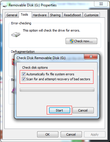 مرحله 3. در این قسمت باید هر دو گزینه Automatically fix file system errors و scan for and attempt recovery of bad sectors را انتخاب کرده و روی دکمه start کلیک کنید.