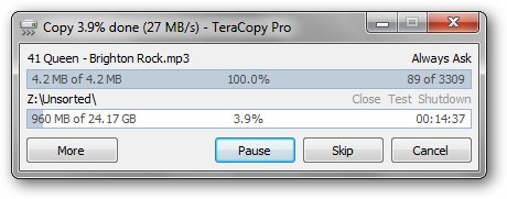 - در موارد دریافت خطا هنگام کپی کردن، TeraCopy مراحل کار را چند بار امتحان میکند و در صورت عدم موفقیت به جای توقف کل انتقال تنها فایل مشکل دار را نادیده میگیرد.