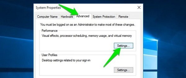 2- به تب Advanced بروید و روی Settings در زیر قسمت Performance کلیک کنید.
