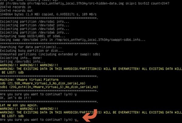 1- کلونزیلا برای آغاز کار از شما تأییدیه میخواهد. بعد از اینکه مطمئن شدید همه چیز درست انتخاب شده حرف "y" را تایپ و Enter کنید.