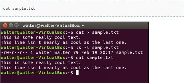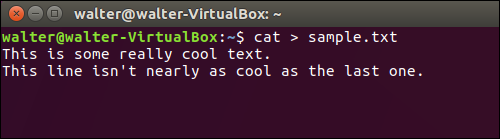 بعد از زدن کلید Enter، دوباره بهاعلان ترمینال برگشت داده نخواهید شد. بلکه، چشمکزن روی خط بعدی قرار میگیرد و میتوانید متن خود را مستقیما در فایل جدید وارد کنید. بعد از نوشتن هر خط، Enter بزنید. وقتی کارتان تمام شد، کلیدهای Ctrl+D را بگیرید تا از فایل خارج و بهاعلان برگردید.