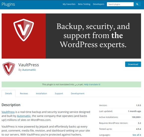 Vault Press یکی از بهترین افزونههایی است که از سوی بنیانگذار وردپرس مت مولن ورگ برای تهیه نسخه پشتیبان از سایتهای وردپرسی ساخته شده است. این افزونه به سادگی قابل استفاده بوده و شما بدون آنکه به اطلاعات فنی سطح بالایی نیاز داشته باشید قادر هستید از آن استفاده کنید. افزونه یاد شده قادر است به شکل بلادرنگ و بر مبنای فرآیندی پیچیده از سایت شما نسخه پشتیبان تهیه کرده و این نسخه پشتیبان را در فضای ابری ذخیرهسازی کند. یکی از مهمترین مزایایی که افزونه فوق دارد این است که دیگر نیازی ندارید به شکل هفتهای نسخه پشتیبان تهیه کنید، به واسطه آنکه این افزونه به شکل تمام وقت از سایت شما نسخه پشتیبان تهیه میکند.