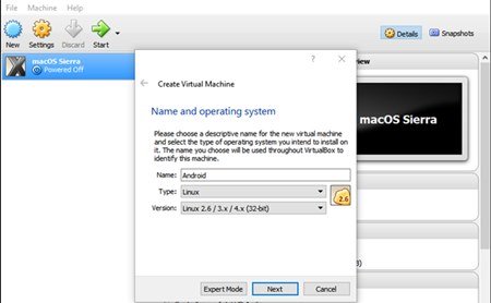 2- هر نامی که تمایل دارید برای این ماشین مجازی انتخاب کنید. سپس، "Linux" را بهعنوان sort و "(Linux 2.6/3.x/4.x (32-bit" را بهعنوان adaptaion تعیین کنید و بعد Next را کلیک کنید.