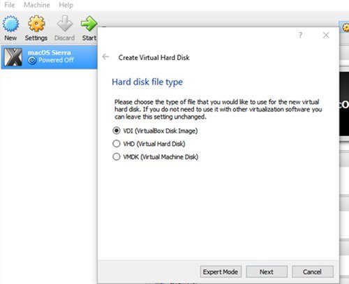 4- برای آغاز ساخت ماشین مجازی گزینه "Make" را انتخاب کنید. بد نیست که نوع فایل را روی VDI تنظیم کنید.