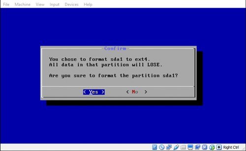 10- برای ایجاد نظم و ساختار مشخص گزینه "ext4" را انتخاب کنید و در صفحه بعد Yes را انتخاب و Enter کنید.