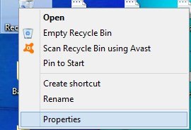 1- در ابتدا، باید نوع عملکرد سطل زباله در ویندوز پیسی را غیرفعال کنید. برای این کار، روی آیکون recycle bin بر روی دسکتاپ ویندوز کلیک راست کنید و سپس، گزینه "properties" را انتخاب کنید.