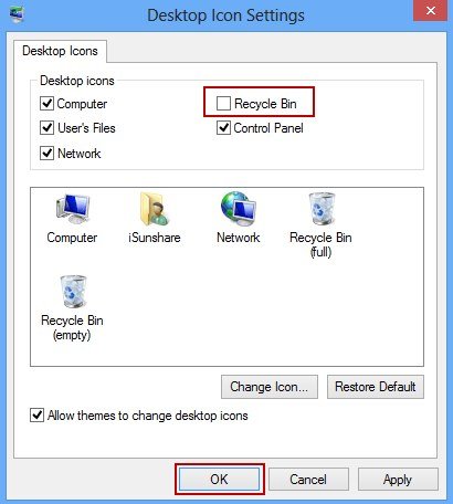 2- تیک کنار آیکون سطل زباله را بردارید و بعد از ذخیره کردن، از صفحه خارج شوید. از حالا بهبعد، خبری از آیکون سطل زباله روی دسکتاپ نخواهد بود.