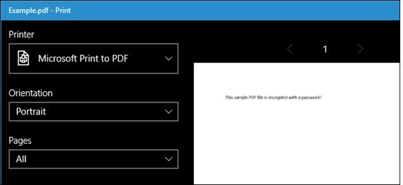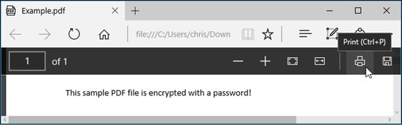 راهکاری که مشاهده کردید در مرورگر کروم روی سیستمعاملهای مختلف کار میکند، اما از همین راهکار در نرمافزارهای مختلف و چاپگرهای پیدیاف نیز میتوان بهره برد. بهطور مثال در ویندوز 10 شما از طریق مرورگر مایکروسافت اج یا PDF Viewer قادر به انجام اینکار خواهید بود. در مرورگر مایکروسافت اج فایل پیدیاف رمزگذاری شده را باز کرده و گذرواژه را وارد کنید. پس از باز شدن فایل روی گزینه Print در نوار ابزار PDF Viewer کلیک کنید.