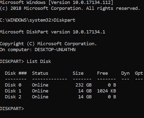 اگر از شماره تخصیص داده شده اطمینان ندارید، حافظه یواسبی را از کامپیوتر جدا کرده و فرمان Diskpart و در ادامه ListDisk را دومرتبه اجرا کنید. با انجام اینکار شماره تخصیص داده شده به درایوها را پیش از آنکه درایو یواسبی خود را به کامپیوتر متصل کنید را مشاهده خواهید کرد. البته از روی اندازهای که در ستون Size نشان داده میشود نیز میتوانید حافظه مدنظر خود را پیدا کنید.