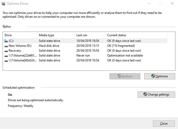 دیفرگ کردن، مشکل از هم گسیختگی فایلهای روی دیسک را برطرف کرده و اجازه میدهد بلوکهای دادهای مربوط به یک فایل پشت سر هم قرار گیرند. در این حالت دیسک به شکل سریعتری به فایلها دسترسی خواهد داشت. دیفرگ به شکل قابل توجهی سرعت دسترسی به فایلها روی هارددیسکها را افزایش میدهد. اما به دلیل اینکه سرعت دسترسی به فایلها روی درایوهای حالت جامد زیاد است، پیشنهاد ما این است که SSD خود را دیفرگ نکنید، به دلیل اینکه طول عمر آنرا کاهش میدهید اما در مقابل هیچ تغییری را مشاهده نخواهید کرد. البته ویندوز 10 به شکل پیشفرض و هفتگی حافظه SSD را دیفرگ کرده و همزمان از TRIM نیز به منظور یکنواخت کردن فرسایش دیسکهای حالت جامد استفاده میکند. پس بهتر است شما خودتان به شکل دستی تصمیم نگیرید حافظه حالت جامد را دیفرگ کنید.