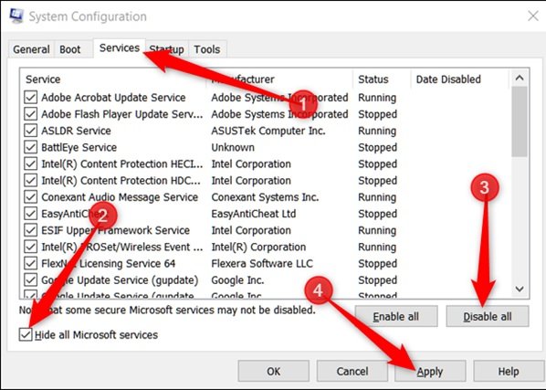 در پنجره ظاهر شده روی زبانه Services کلیک کنید تا فهرست همه سرویس‌های اجرا شده روی کامپیوتر خود را مشاهده کنید. در پایین این پنجره گزینه Hide All Microsoft Services را کلیک کرده و سپس گزینه Disable All را انتخاب کنید. این گزینه همه سرویس‌های غیر مایکروسافتی اجرا شده روی سیستم را غیر فعال می‌کند. روی دکمه Ok کلیک کنید تا تغییرات اعمال شوند.