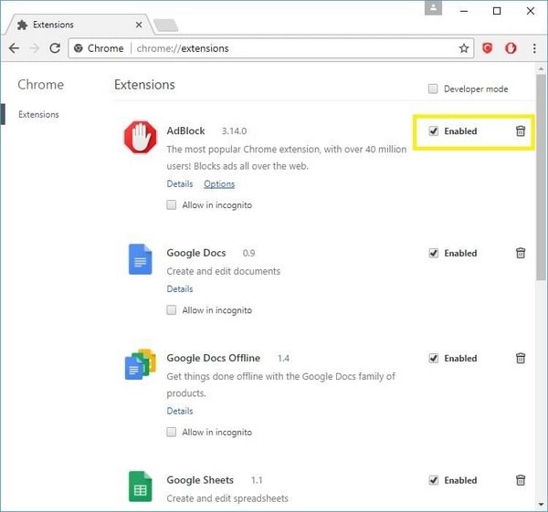 با این کار یک تب جدید باز خواهد شد که فهرستی از افزونههای کروم در آن قرار دارد. شما میتوانید با حرکت در این فهرست اسامی افزونههایی که از نصب آن اطلاع نداشتید را پیدا کنید. اگر در این فهرست با افزونه مشکوکی برخورد کردید این احتمال وجود دارد که یک adware خود را به عنوان یک افزونه واقعی جا زده باشد.
