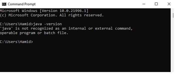 توسعهدهندگان میتوانند از کاتلین روی پلتفرمهای مختلف استفاده کنند. از بسیاری جهات، کاتلین در مسیری قرار دارد که جاوا در دهه 90 میلادی آنرا پیمود. کاتلین بر مبنای ایده ساخت یک زبان برنامهنویسی چند پلتفرمی جدید ابداع شده است تا توسعهدهندگان پلتفرمهای مختلف بدون مشکل قادر به استفاده از آن باشند. در دنیای برنامهنویسی جاوا، برنامههای جاوا بهجای کامپایل به کد ماشین بومی هر پلتفرم، به قالبی که بایتکد (Bytecode) نام دارد کامپایل میشوند. این بایتکدها در یک برنامه کاربردی که ماشین مجازی جاوا (Java Virtual Machine) نام دارد، اجرا میشوند. با اجرای بایتکدها در ماشین مجازی، میتوانید کدها و برنامههای جاوا را روی سیستمهایی که پیشنیازهای اولیه روی آنها نصب شدهاند، اجرا کنید. زبان برنامهنویسی کاتلین تعامل نزدیکی با زبان برنامهنویسی جاوا دارد، به همین دلیل، باید اطمینان حاصل کنید حداقل نسخه 11 کیت توسعه جاوا روی سیستمعاملتان نصب شده است. برای این منظور، پنجره خط فرمان را باز کنید و دستور java -version را در آن تایپ کنید. اگر با اجرای دستور فوق، پیغامی همانند شکل 1 دریافت کردید، به این معنا است که جاوا روی سیستمتان نصب نیست.