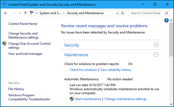 برای کنترل این فرآیند، به کنترل پنل، System & Secutiry و سپس Security and Maintenance بروید. همچنین، میتوانید با باز کردن منوی استارت این کلمه را جستجو کنید و روی میانبر Security and Maintenance کلیک کنید تا مستقیما به پنجره آن بروید.