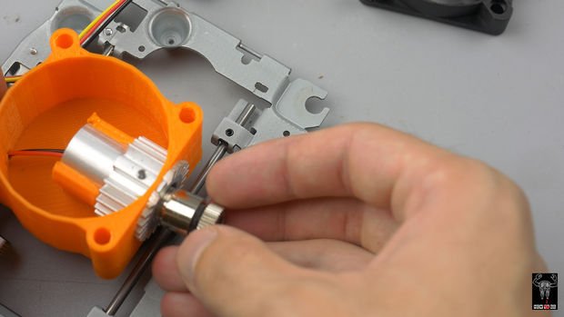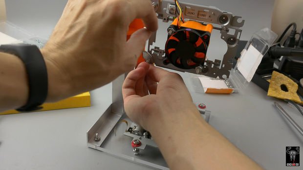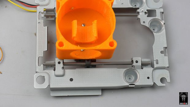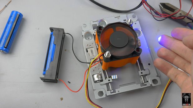 مرحله بعدی استفاده از لیزر است، اگر از یک درایو DVD RW استفاده کرده باشید میتوانید از دیود لیزر آن برای این پروژه استفاده کنید. در اینجا ما قصد داریم از یک ماژول لیزر دست ساز 1.5w 445nm استفاده کنیم. برای استفاده طولانی مدت ما باید این لیزر را خنک نگه داریم. برای DVD یک تکه کوچک از آلومینیوم کفایت میکند، اما با لیزر قویتر باید از سیستم خنک کننده استفاده کنیم. ما از براکت پرینت شده برای ثابت نگه داشتن دیود لیزر به یک هیت سینک و یک فن 50 میلیمتری استفاده میکنیم. همچنین از آنجا که هوا تنها از پایین خارج میشود ما مشکل تخلیه دود از سطح حکاکی را با این روش حل کردیم. برای حفظ ایمنی شما باید حتما از عینک محافظ لیزر نیز استفاده کنید.