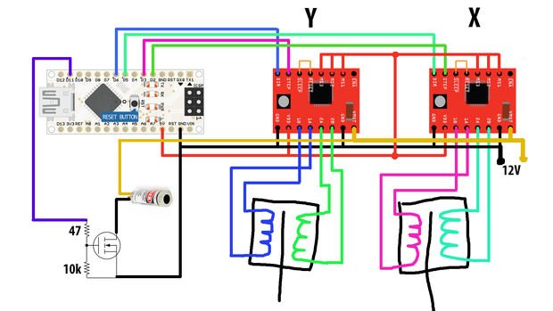 برای کنترلر اصلی ما از یک Arduino nano استفاده میکنیم، همچنین به دو استپ موتور A4988، MOSFET IRFZ44N، دو مقاومت 47 اوهم و 10 کیلواهم نیز نیاز داریم. منبع تغذیه مورد نیاز برای موتورها و لیزر باید 12 ولت و حداقل 3 آمپر باشد. برق مورد نیاز Arduino نیز مستقیما از usb تامین میشود. یکی از نکاتی که باید به آن توجه ویژهای داشته باشید خنک کننده لیزر است، زیرا با توان 700mA گرمای زیادی تولید میشود. ما این مدار را روی بردبورد نصب کردیم. MOSFET به کار رفته در این مدار نیازی به هیت سینک ندارد.