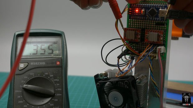 در بخش الکترونیک ما باید جریان درست استپ موتورها را قبل از اتصال به آن تنظیم کنیم. برق 12 ولت را وصل کنید، Arduino را به کامپیوتر متصل کنید و ولتاژ پتانسیومتر تریمر را اندازه گیری کنید. شما میتوانید از طریق فرمول زیر آن را محاسبه کنید:
