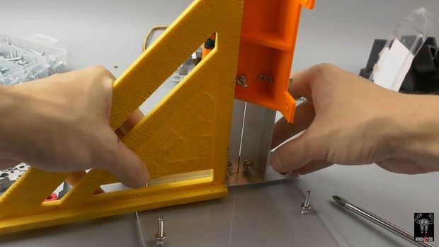 ما در این پروژه در حدود 1 متر آلومینیوم نبشی و یک قطعه شیشه آکریلیک استفاده کردیم که پایه کار را به وسیله آن بسازیم و محور Y را با استفاده از پیچهای کوچک روی آن نصب میکنیم. سپس محور X را روی آلومینیوم نبشی و براکت چاپ سه بعدی نصب میکنیم. همچنین بهتر است که برای سطح اصلی کار پایههای پلاستیکی بسازید. هر چه سطح میز کار شما صافتر باشد بهتر عمل میکند. برای صرفه جویی در وقت میتوانید یک بار دیگر از چاپگر سه بعدی استفاده کنید.